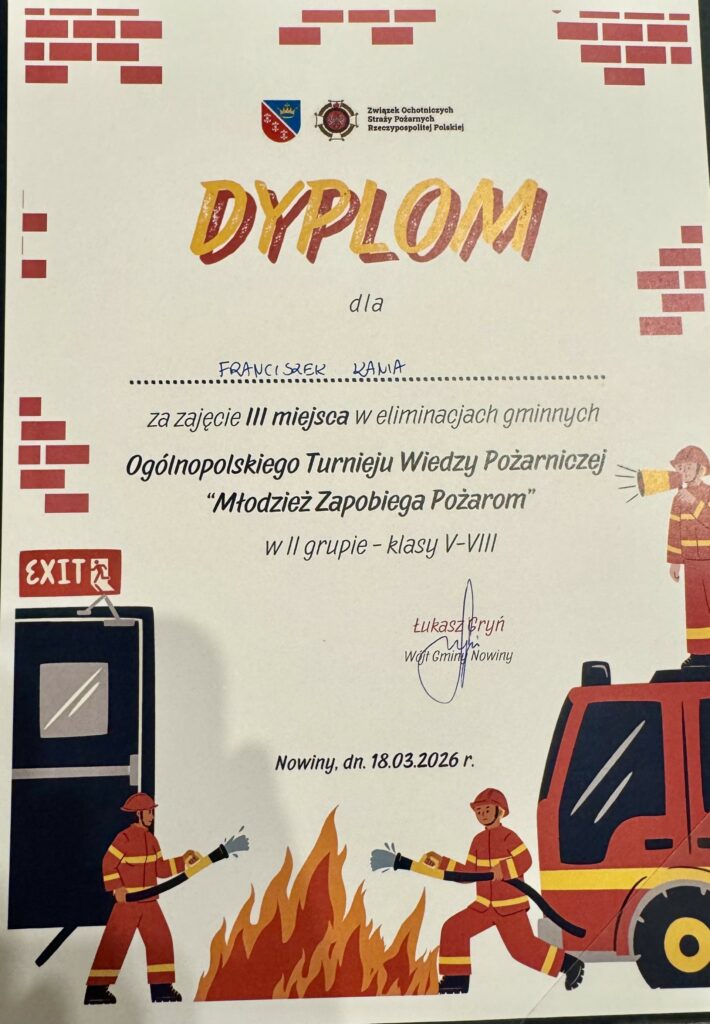 W dniu 18 marca 2026 roku w sali konferencyjnej Urzędu Gminy Nowiny odbyły się eliminacje gminne Ogólnopolskiego Turnieju Wiedzy Pożarniczej „Młodzież Zapobiega Pożarom”. W wydarzeniu wzięło udział 15 uczniów z Zespołu Placówek Oświatowych w Bolechowicach, Zespołu Placówek Integracyjnych w Kowali oraz Szkoły Podstawowej w Nowinach.